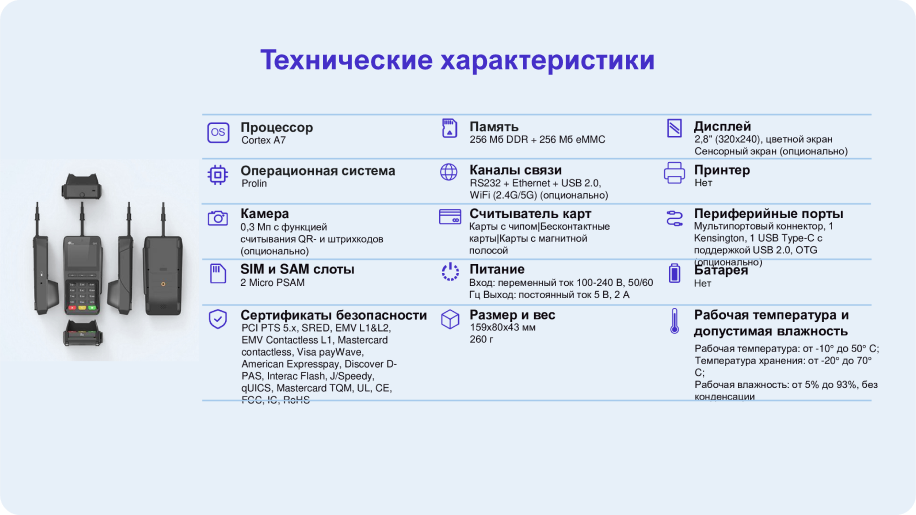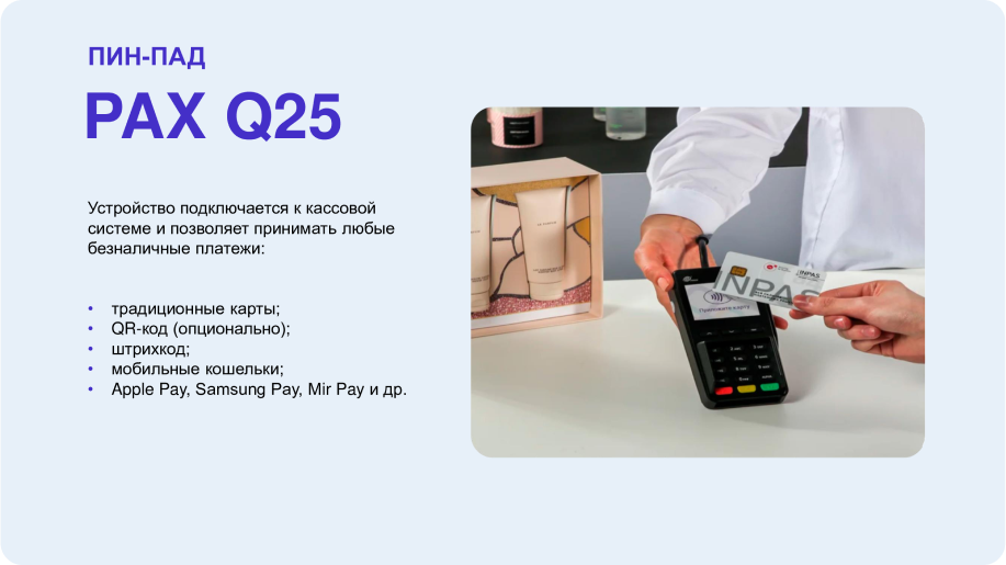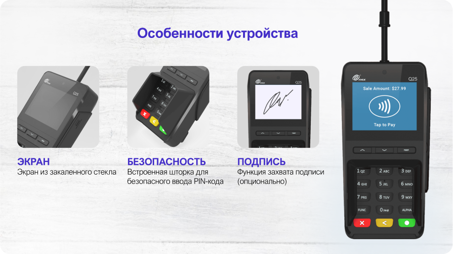 прием безналичных платежей, экран из закаленного стекла, встроенная шторка для безопасного ввода PIN-кода